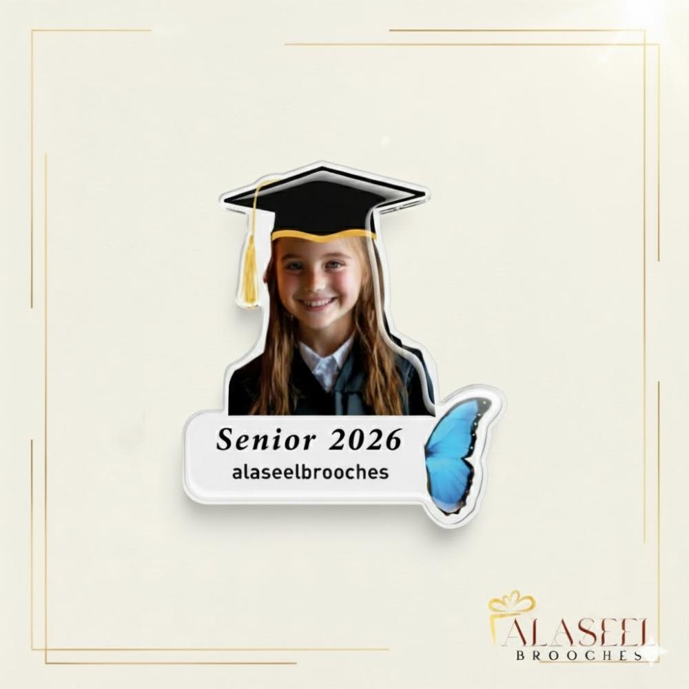 بروش التخرج بالفراشة الزرقاء تصميم أكريليك مخصص بالإسم والصورة