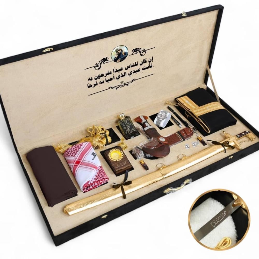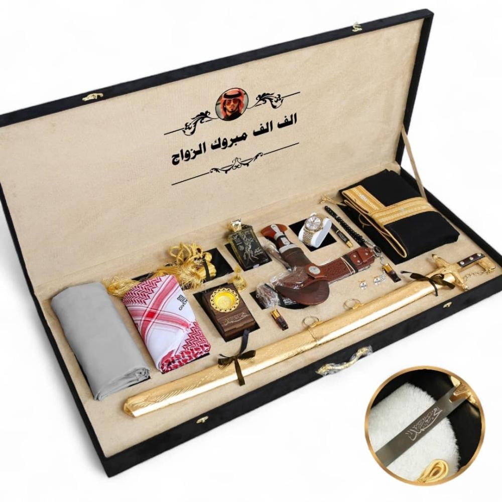 في قلب هذا الصندوق، تجتمع أركان الهيبة التي تروي قصة الأصالة والقوة. السيف السوري الفاخر، المصنوع بدقة متناهية، ليس مجرد قطعة فنية، بل هو رمز للشرف والمكانة الرفيعة. بجانبه، يأتي البشت عالي الجودة ليضيف وقاراً لا يضاهى، بينما يكتمل المشهد مع الخنجر بتصميمه التقليدي وحزامه الجلدي، ليكوّنوا معاً ثلاثية خالدة من التراث العريق الذي يُعتز به.