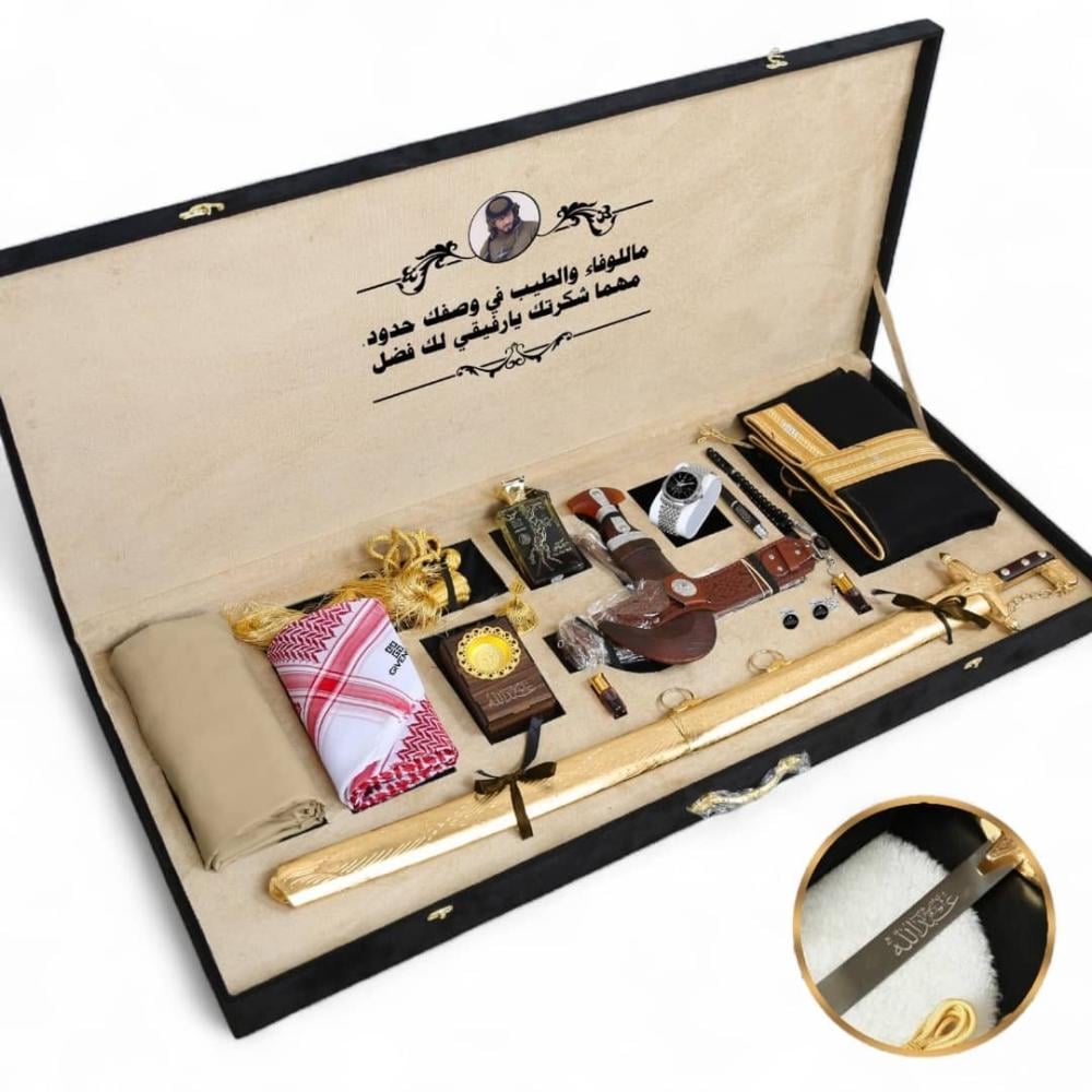 تخيل لحظة التقدير المطلق، حين يُفتح صندوق الهيبة الملكي ليكشف عن بانوراما متكاملة من الفخامة والتراث، كل قطعة فيها مُختارة بعناية فائقة لتكون أبلغ رسالة تكريم وإجلال لمن له مكانة لا تضاهيها مكانة. هذه ليست مجرد هدية، بل هي تتويج للحظات العمر التي لا تُنسى.
