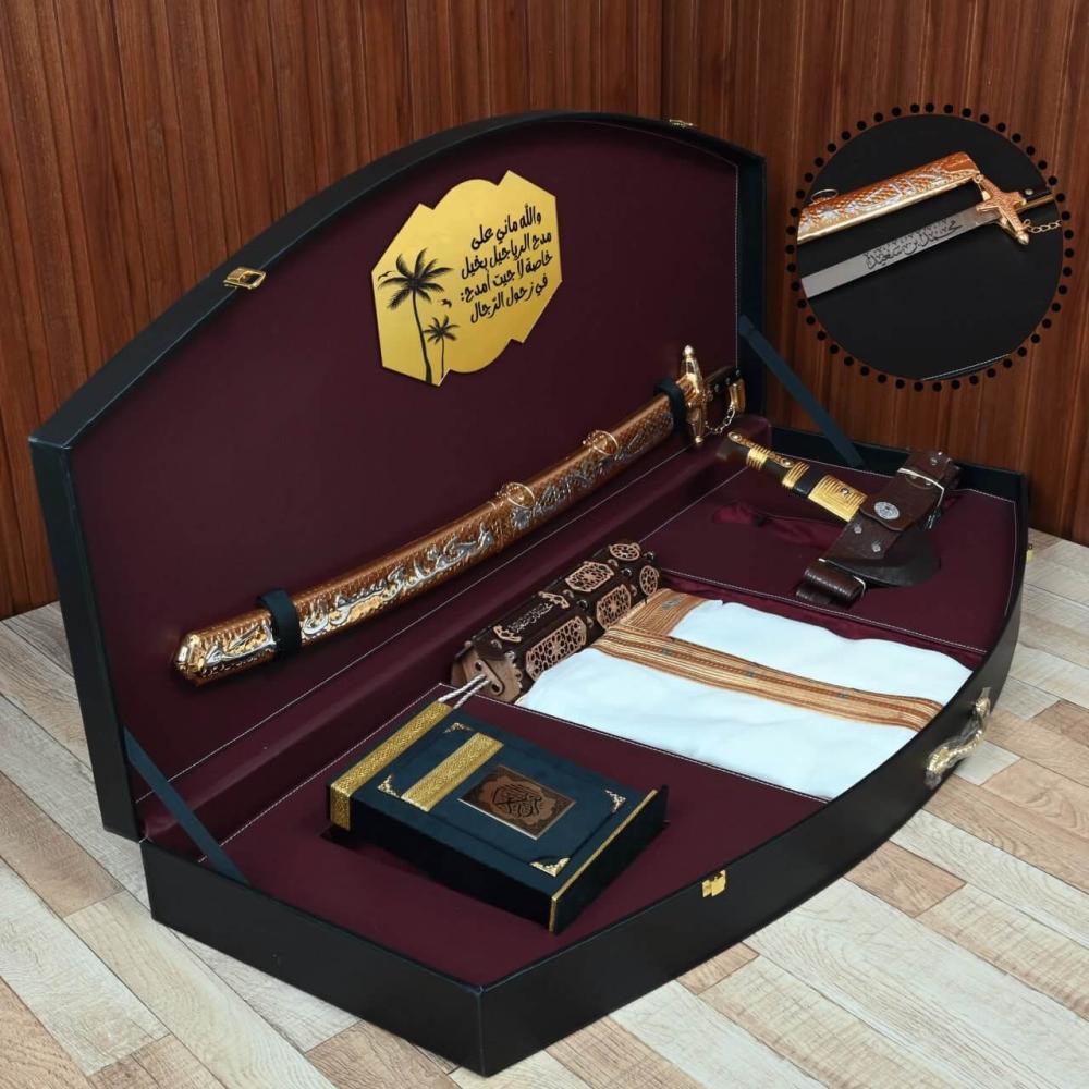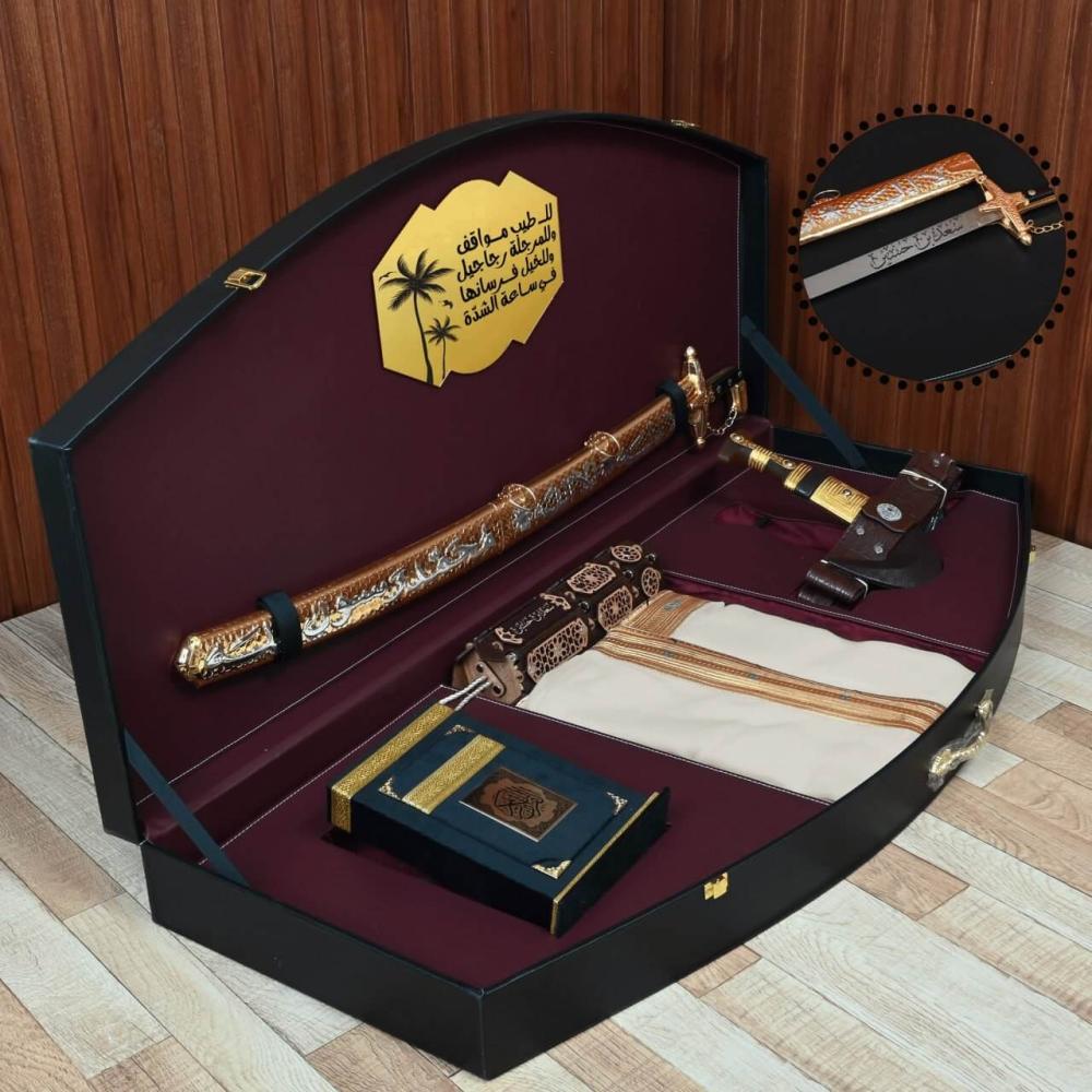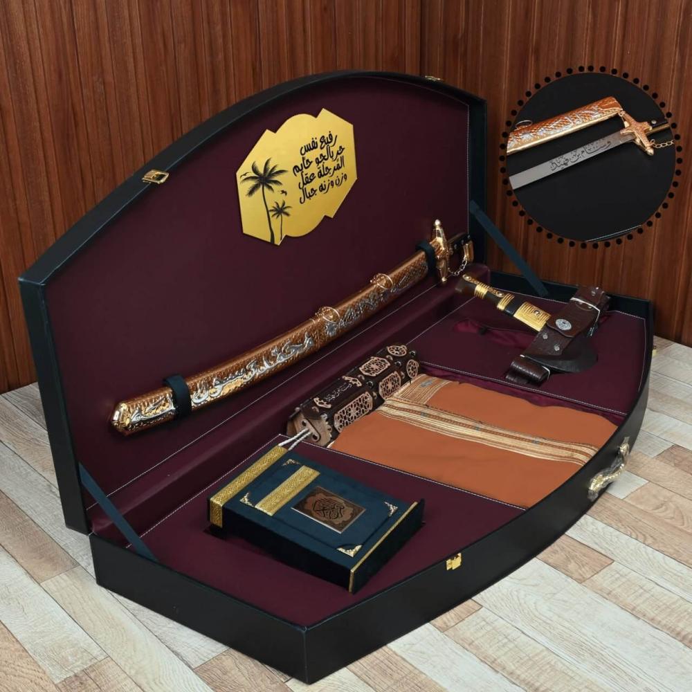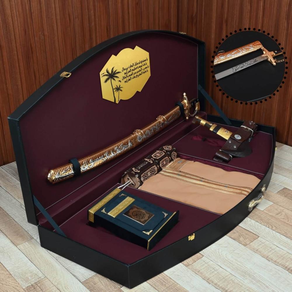 هدية فاخرة تحتوي على مشلح حساوي وسيف محفور مع خنجر ومبخرة مخصصة