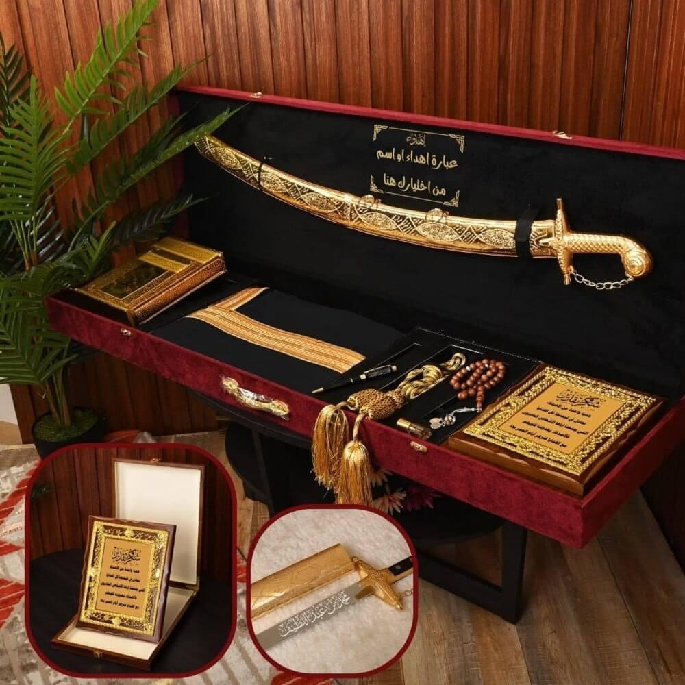 المشلح الحساوي الفاخر والسيف العربي المهيب، وكلاهما مصنوع بحرفية سورية عريقة تضمن جودة لا تضاهى. هذه التفاصيل ليست عادية، بل هي شهادات جودة تضمن أنك تقدم تحفاً فنية أصلية، تليق بأعلى المقامات وتلبي معايير الذوق الرفيع.