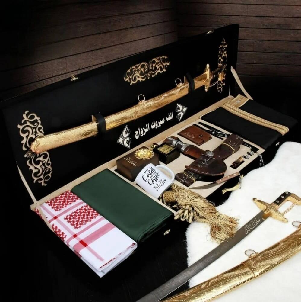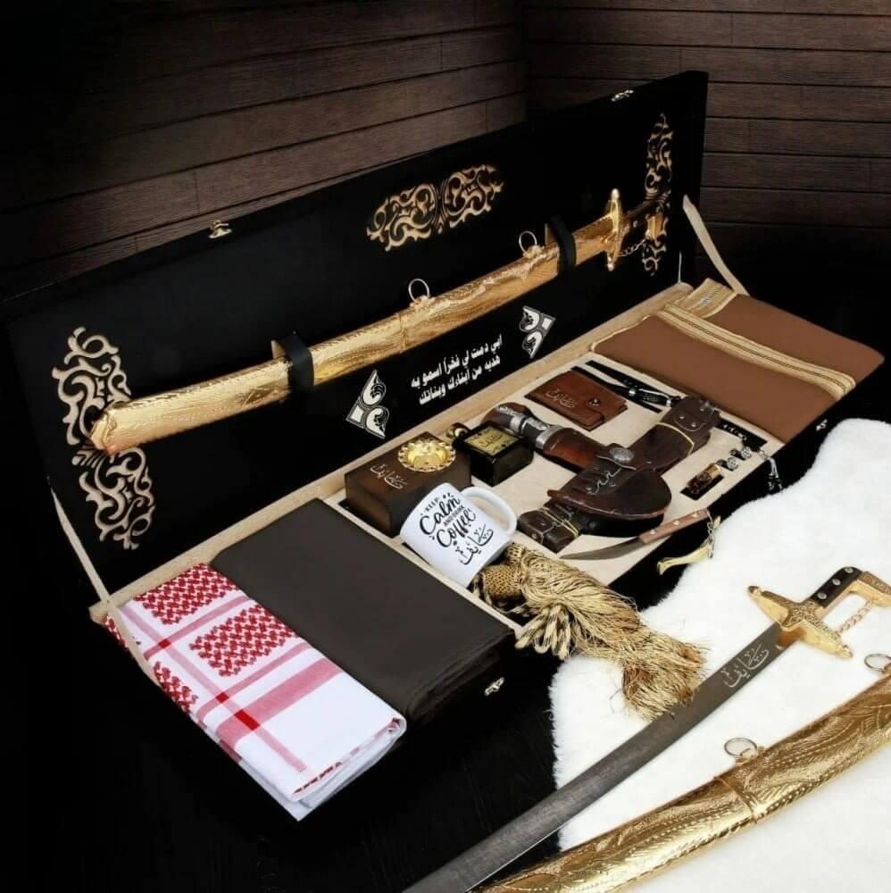 يكتمل مشهد الأصالة برموز القوة والهيبة. يضم الصندوق سيفاً عربياً مهيباً يمكن تخصيصه بالاسم، وإلى جانبه الخنجر الخليجي بحزامه الجلدي. هذان الرمزان الخالدان يمثلان إرثاً من الشموخ والتقاليد المتجذرة، ويؤكدان على القيمة التراثية العميقة للهدية.