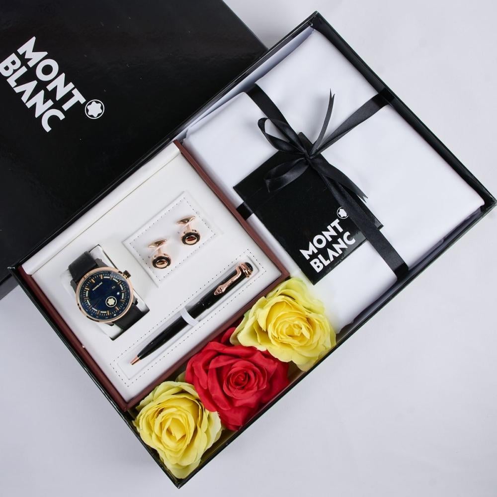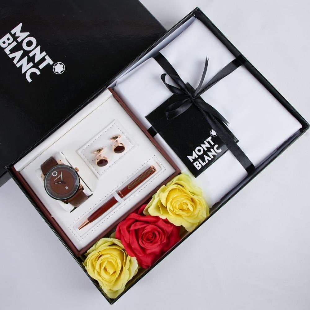 بوكس رجالي يجمع قماش وساعة جلد وقلم وكبك