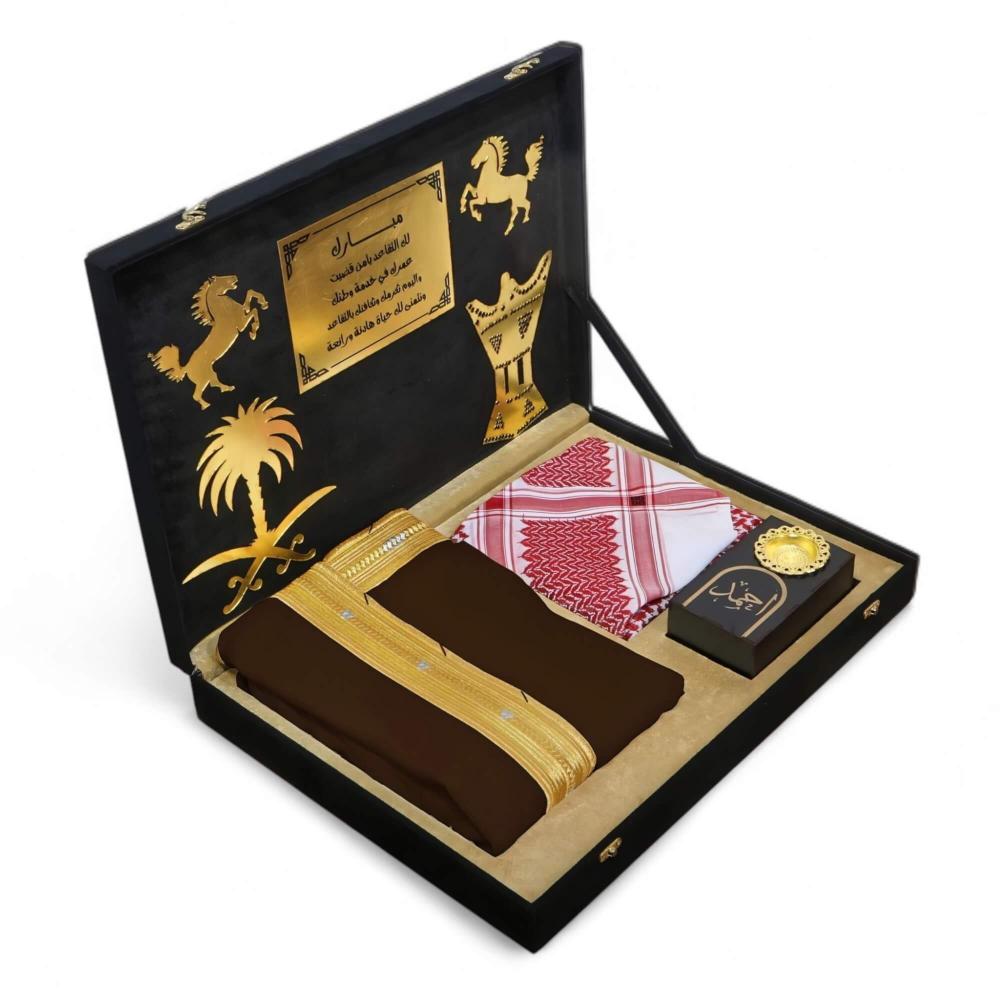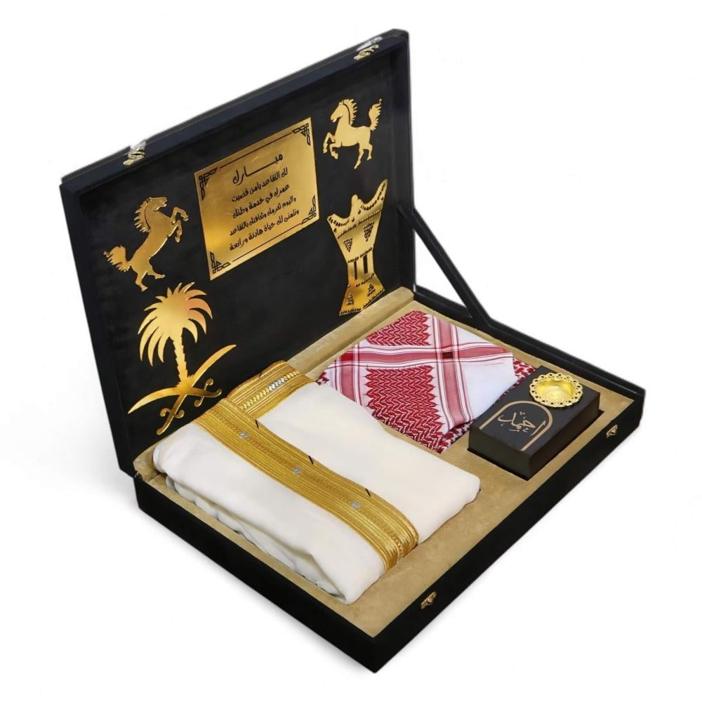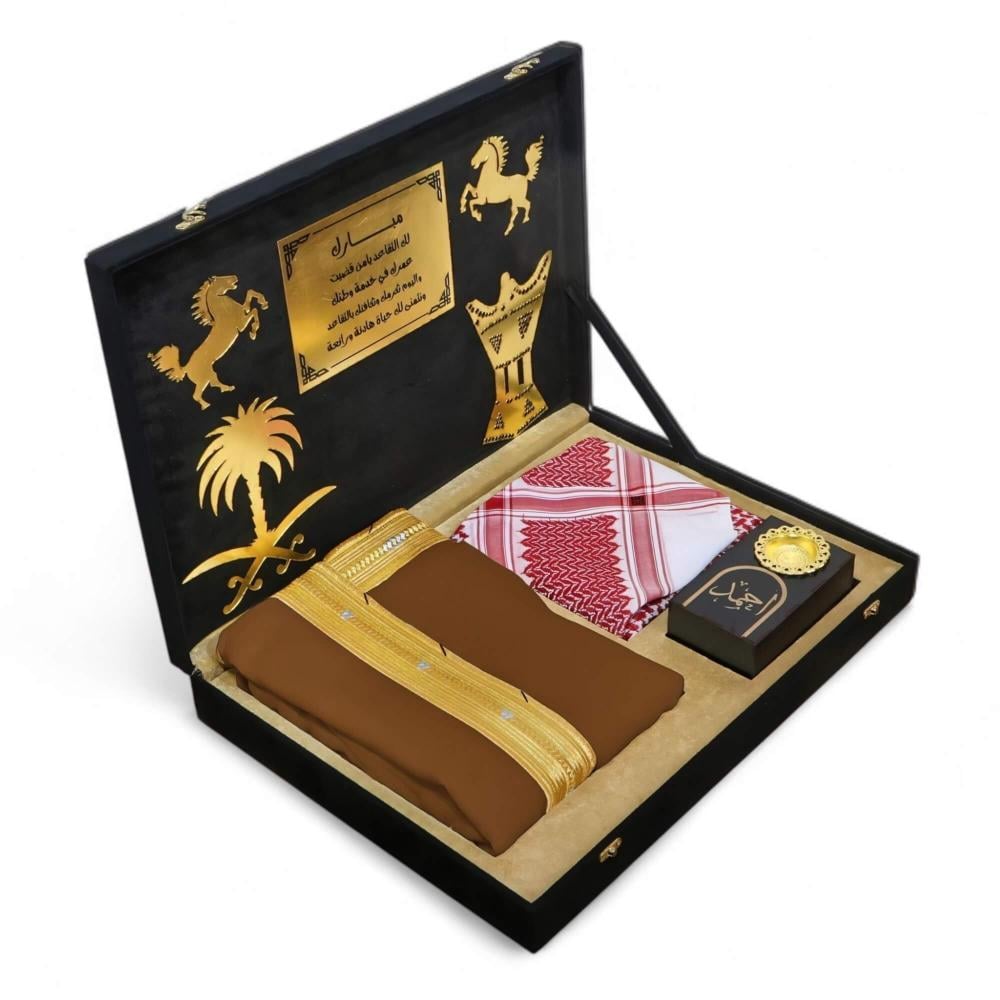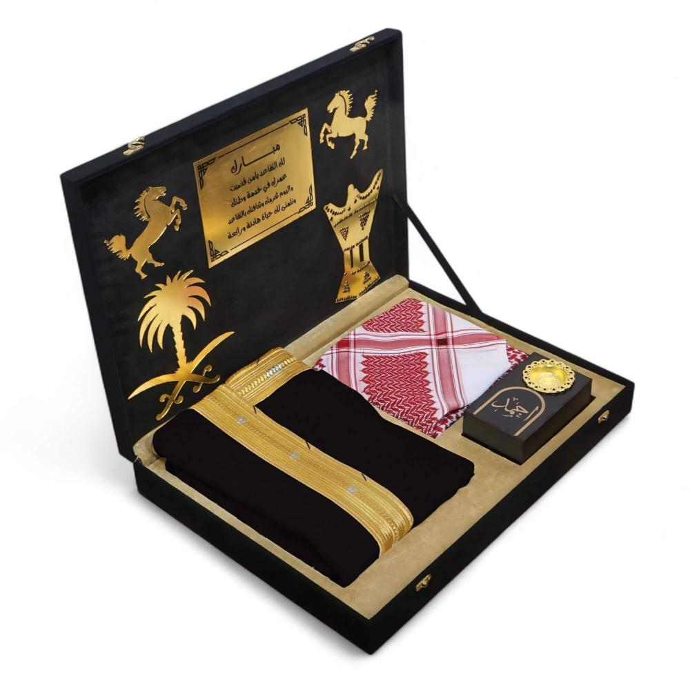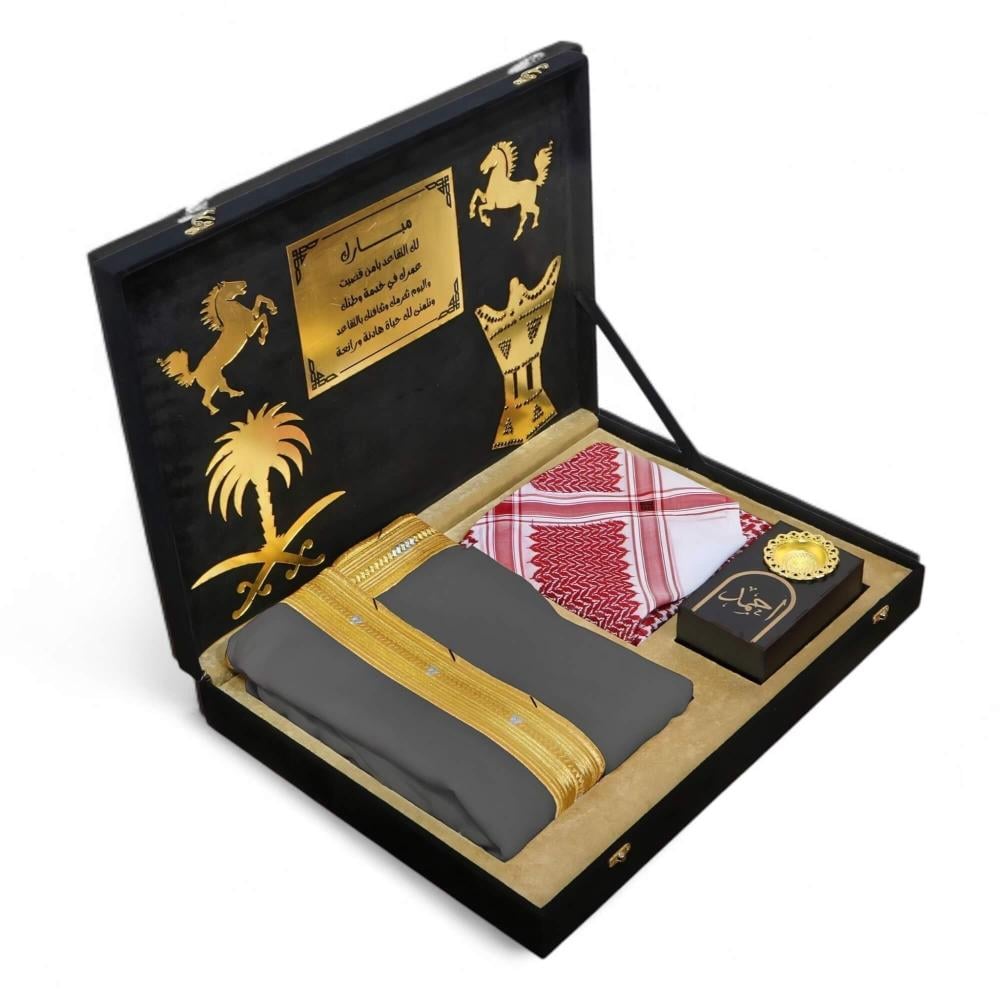 تُقدّمُ هذه المجموعةُ المتكاملةُ من الهدايا الراقية في صندوقٍ خشبيٍّ متينٍ وقوي، مُغطى بالكاملِ بقماشِ الشمواه الأسود الراقي الذي يمنحُهُ ملمساً فاخراً ومظهراً ملكياً يأسرُ الأنظار. هذا الصندوقُ ليس مجردَ تغليف، بل هو جزءٌ لا يتجزأ من فخامةِ الهديةِ وقيمتِها.