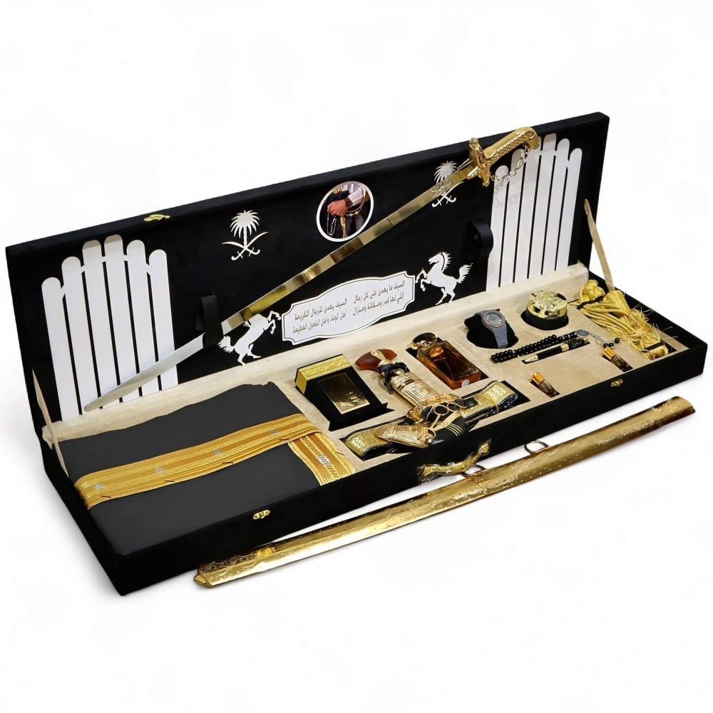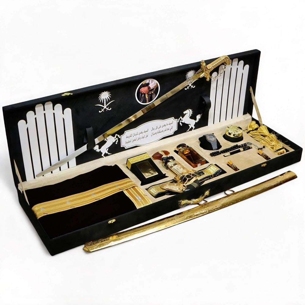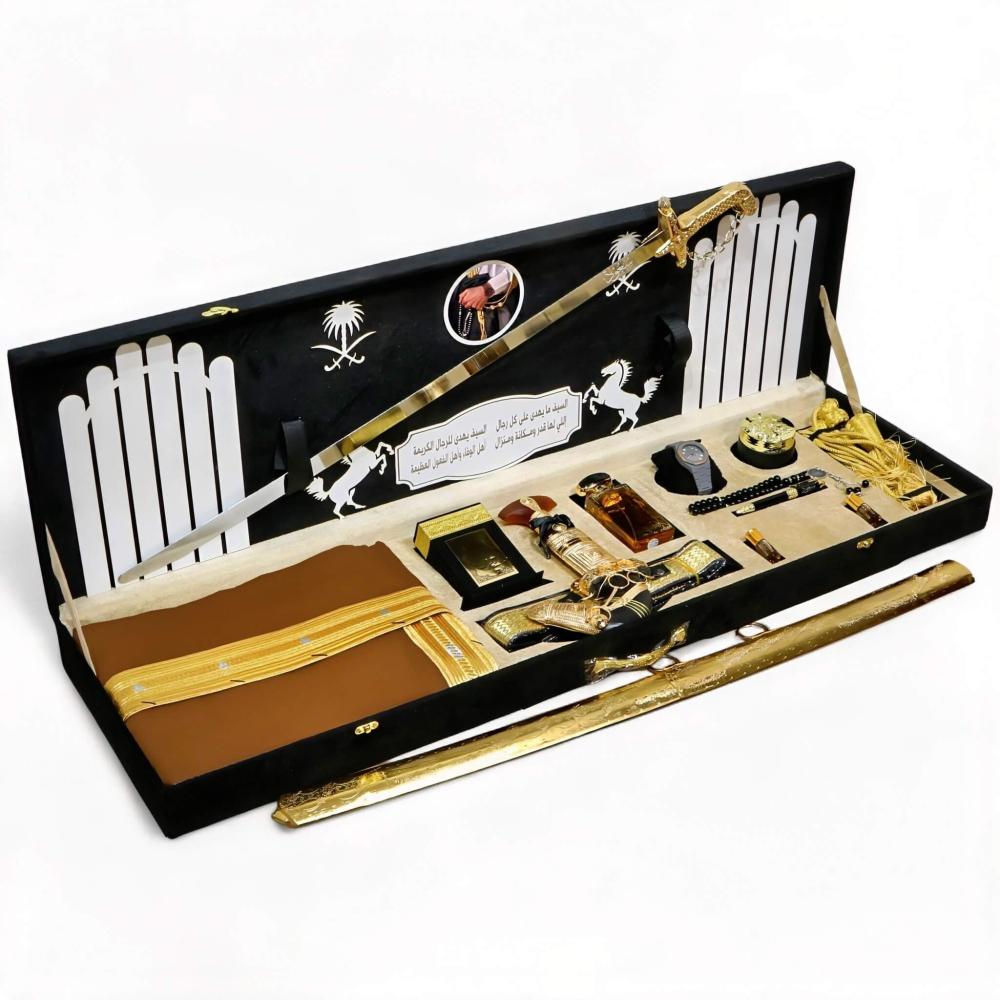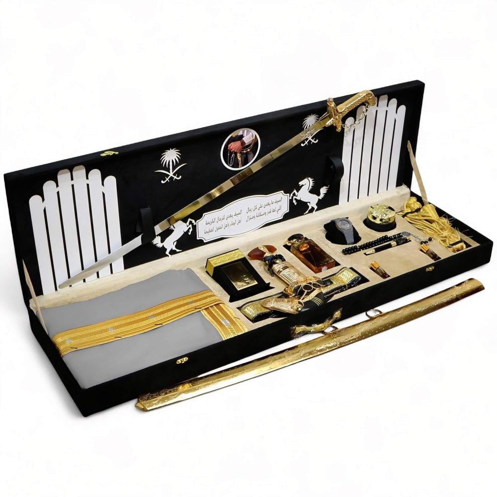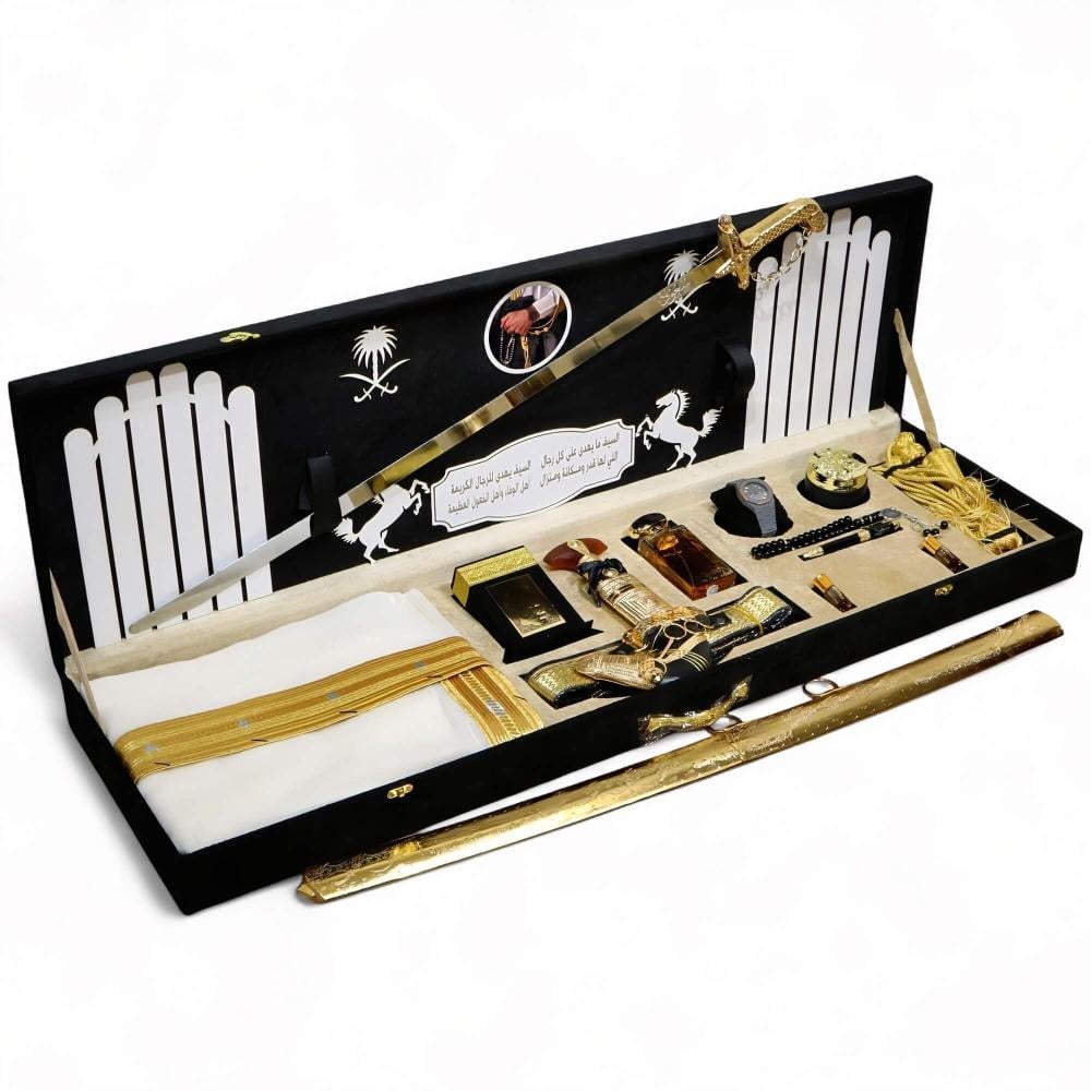 هذا الجزء من الهدية هو تكريم لإرثه وقوته. يضم البشت الملكي الذي يرمز لمكانته الرفيعة، والسيف العربي المهيب المحفور باسمه كدليل على عزته، والخنجر الذهبي المزخرف الذي يعكس أصالة التقاليد. هذه القطع ليست مجرد تحف، بل هي شهادة تقدير لتاريخه وكل ما بناه، وهي تقول له: "نحن نرى قوتك ونفخر بإرثك".