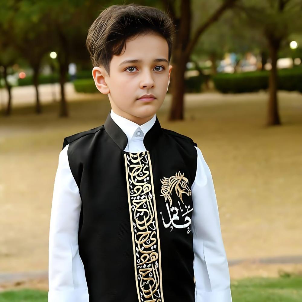 اجعل طفلك يتألق بإطلالة راقية مع سديري فاخر باللون الأسود الكلاسيكي، حيث يجمع بين الأصالة والفخامة بلمسات عصرية مثالية للمناسبات الخاصة.