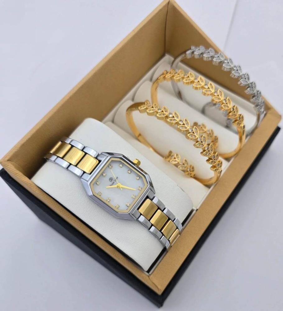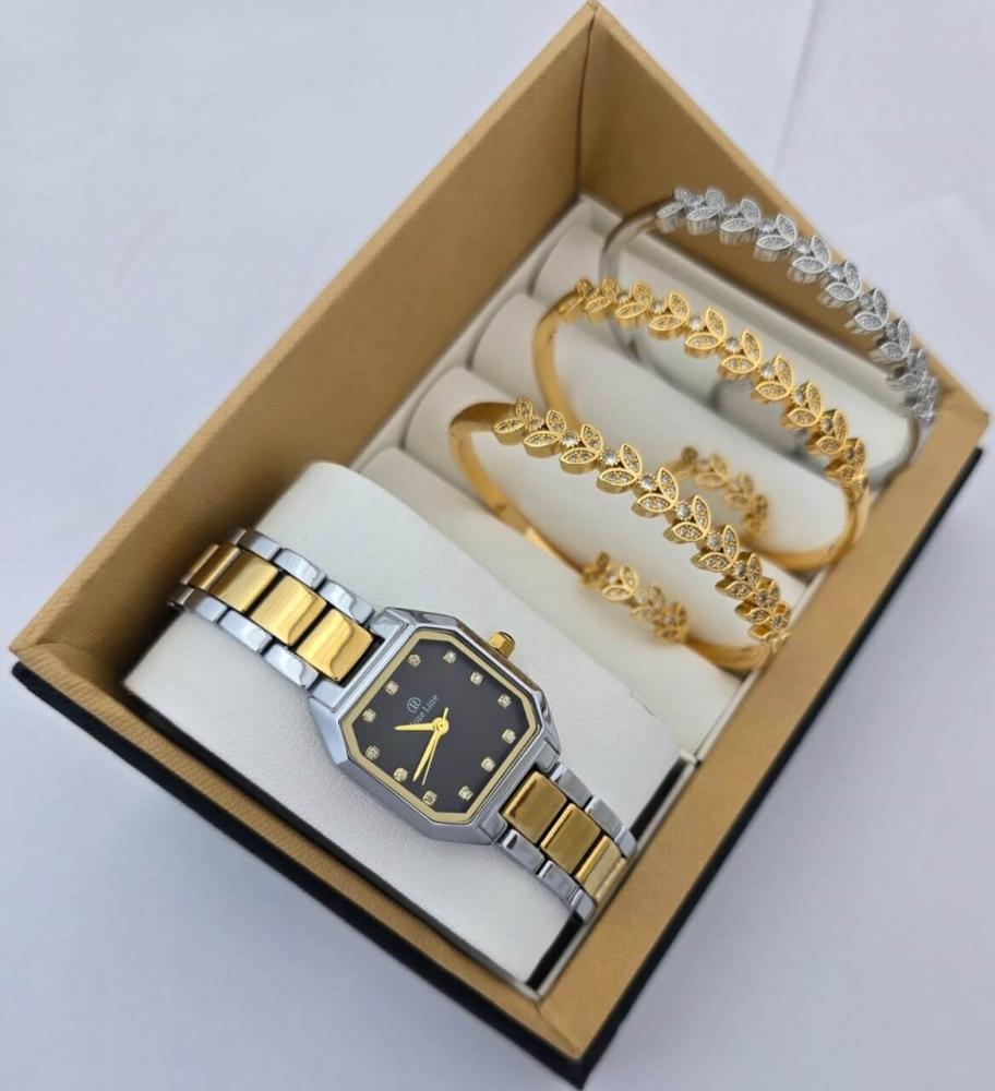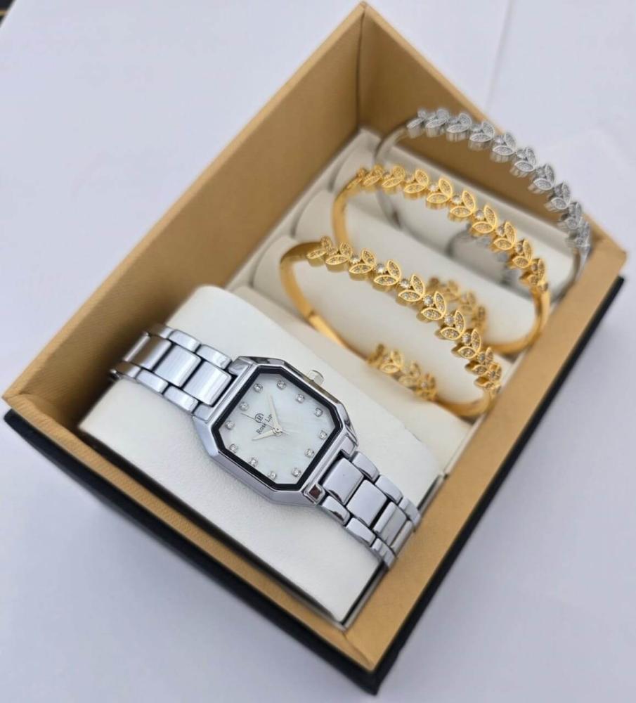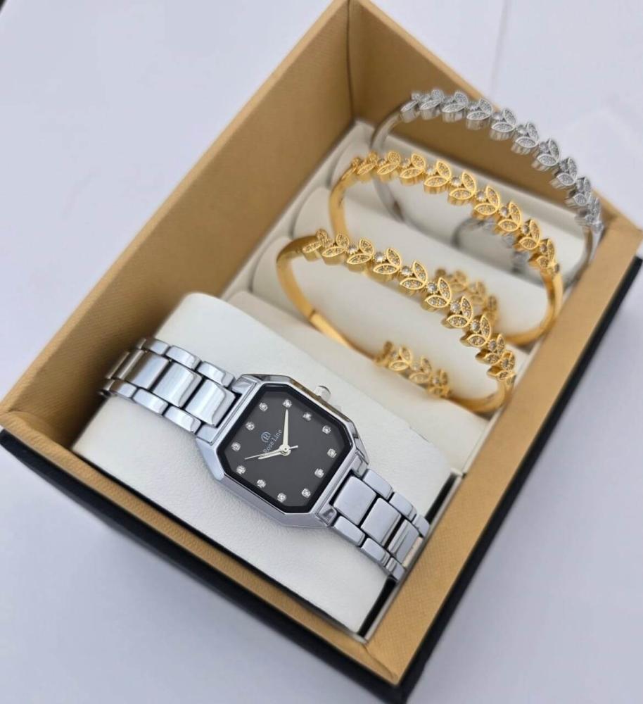 طقم نسائي فاخر ساعة من الإستانلس ستيل وأساور بزركون لامع