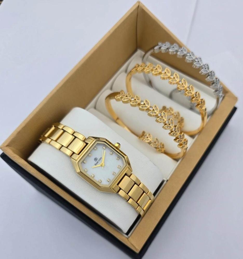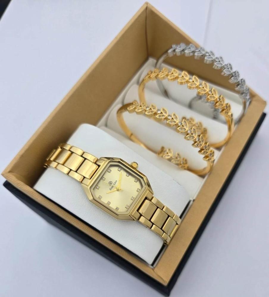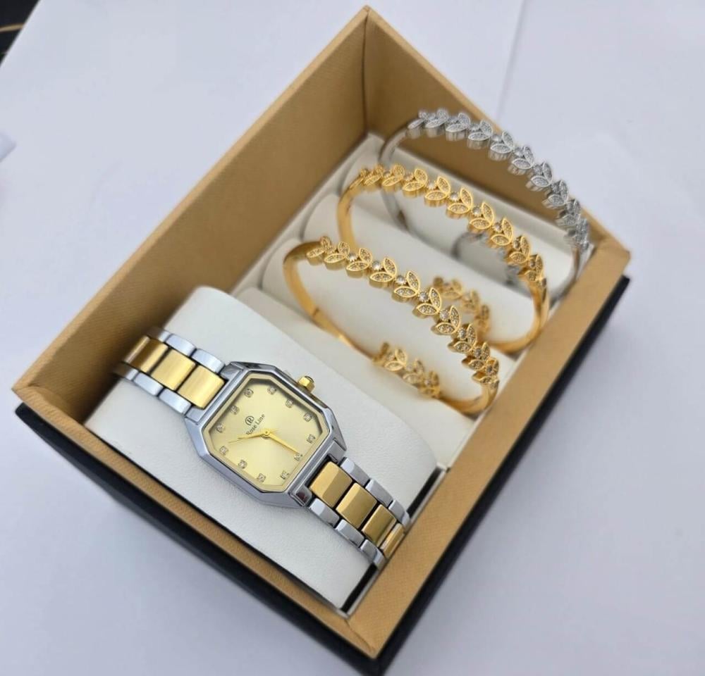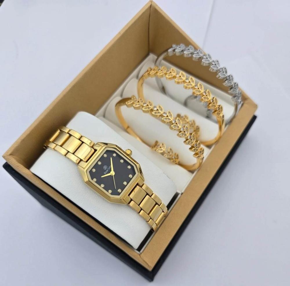 طقم نسائي فاخر ساعة من الإستانلس ستيل وأساور بزركون لامع