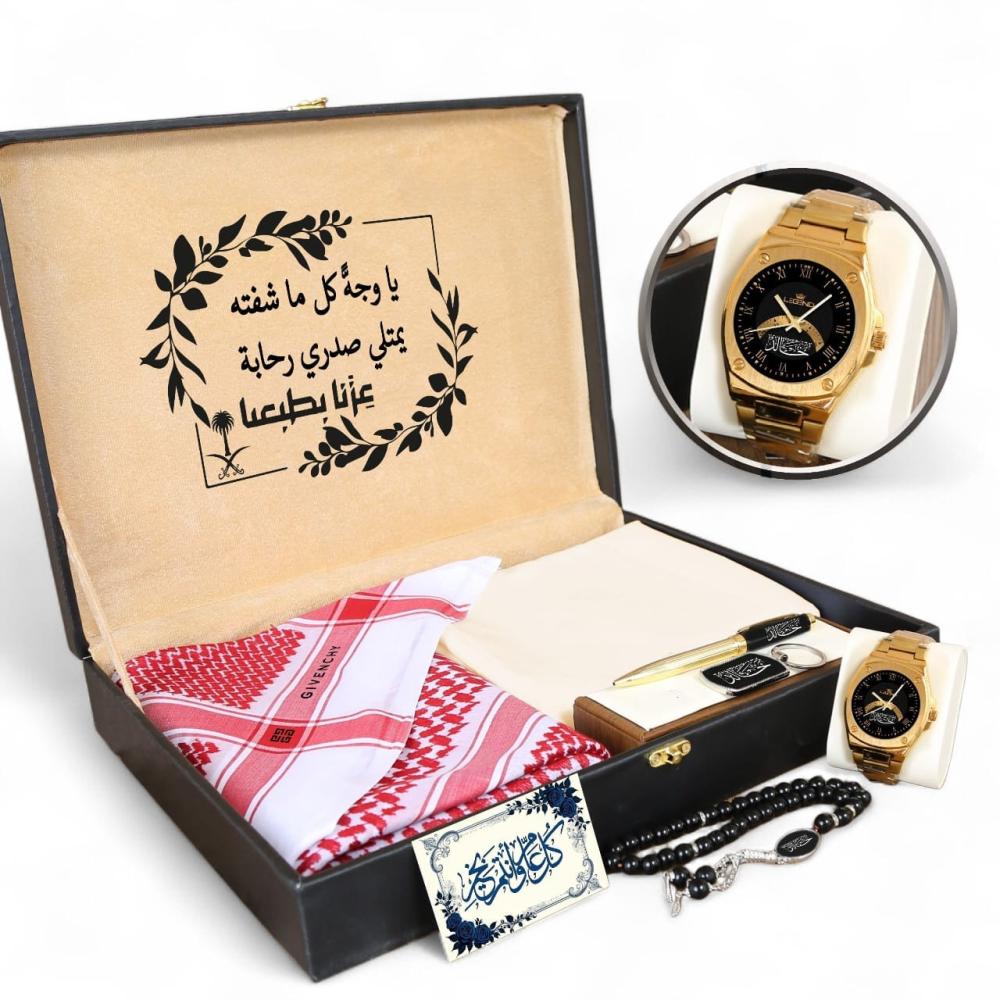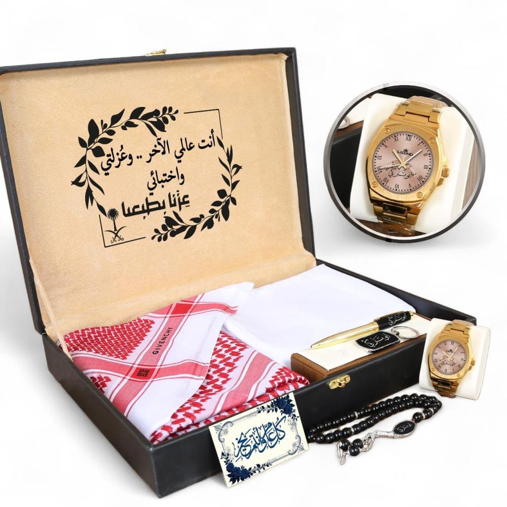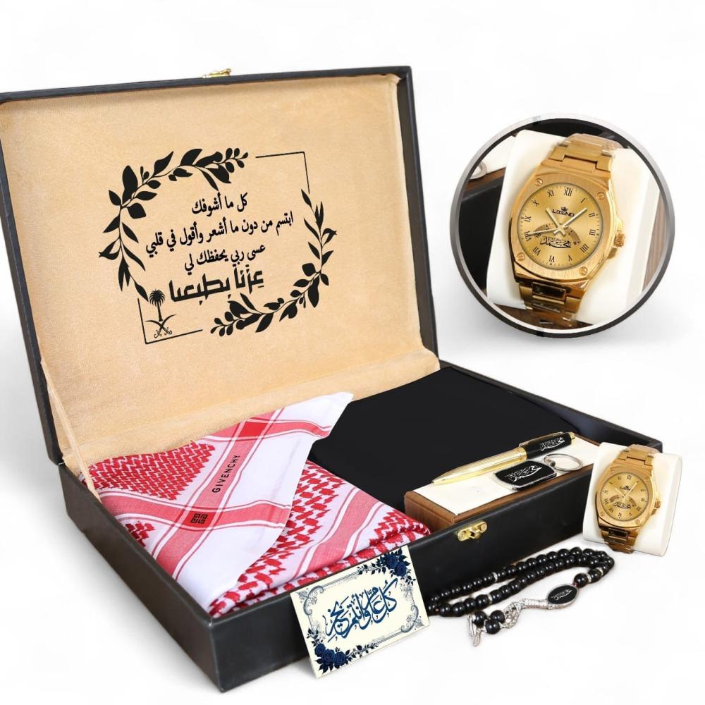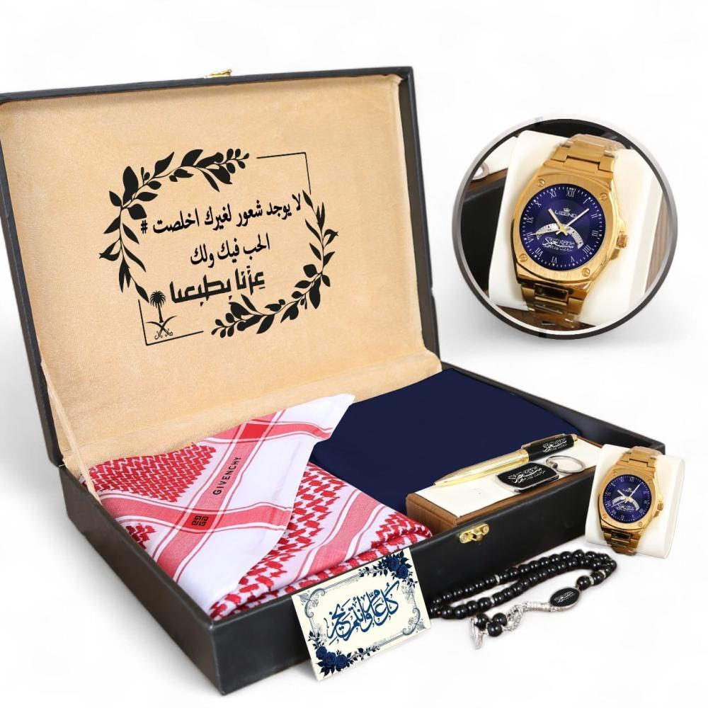 من الشماغ الفاخر والقماش الصيفي العملي إلى الساعة العصرية والنظارات الجذابة، تم اختيار كل مكون ليجمع بين المظهر الراقي والاستخدام اليومي. الساعة تأتي بتصميم عصري وجودة تضمن رضا تام، مما يجعلها هدية تدوم لسنوات وترافقه في كل لحظاته.