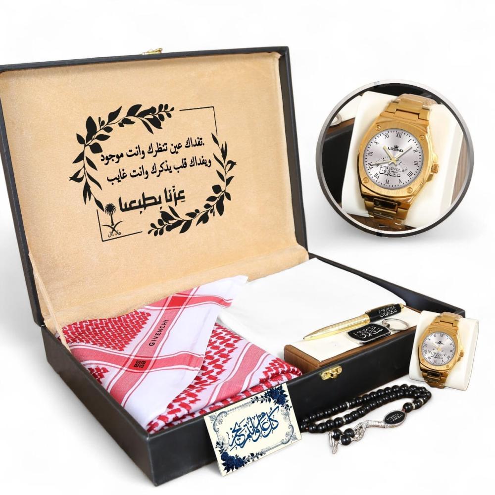 • تخصيص بالاسم: عبر تقنية نحت الليزر الدقيقة على القلم، السبحة، والميدالية، بالإضافة إلى الساعة.