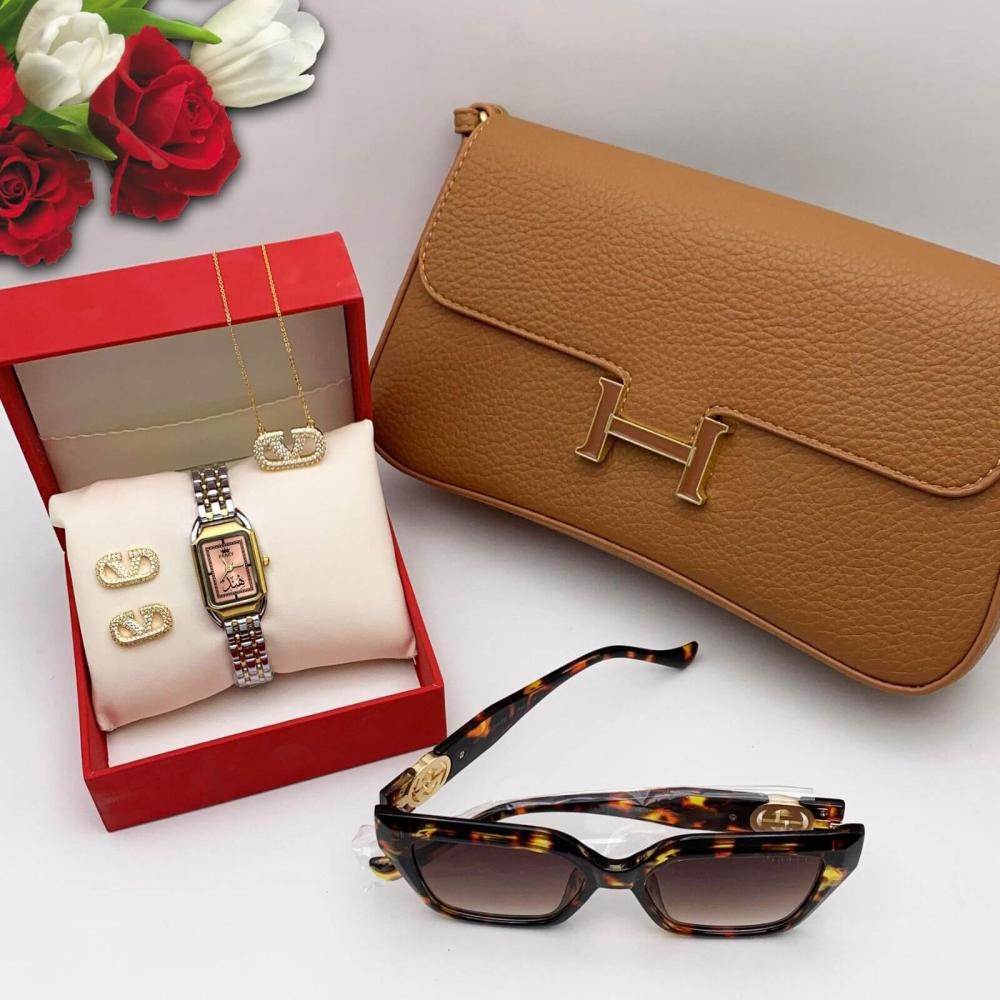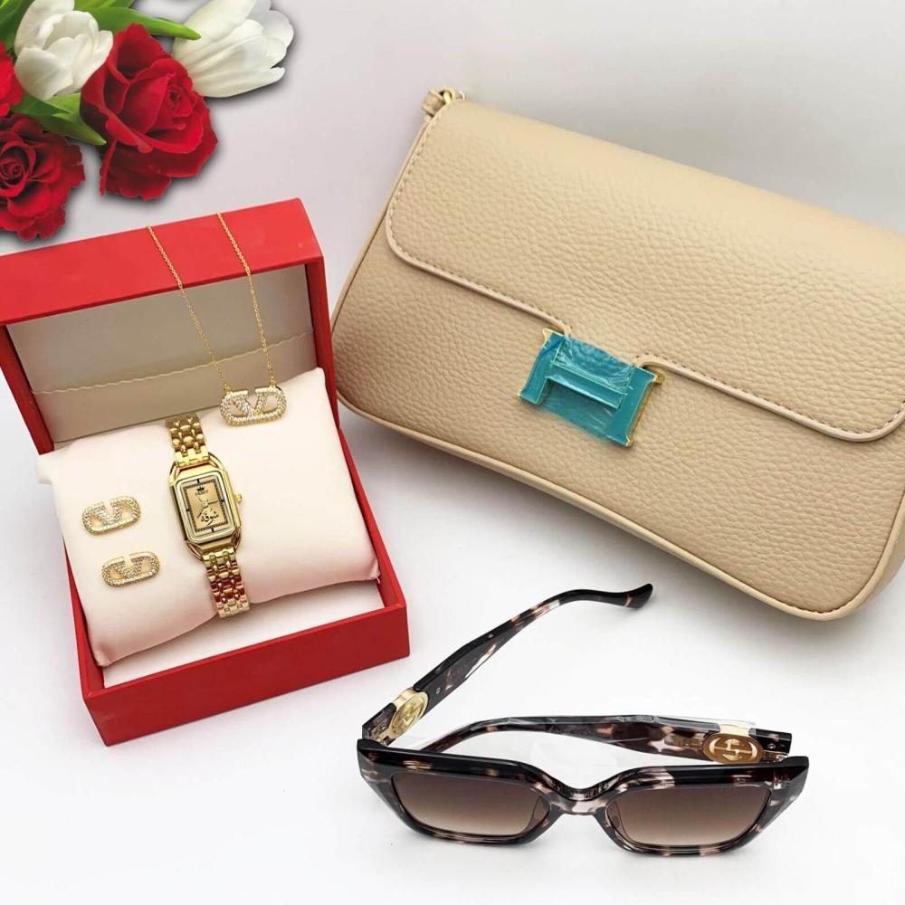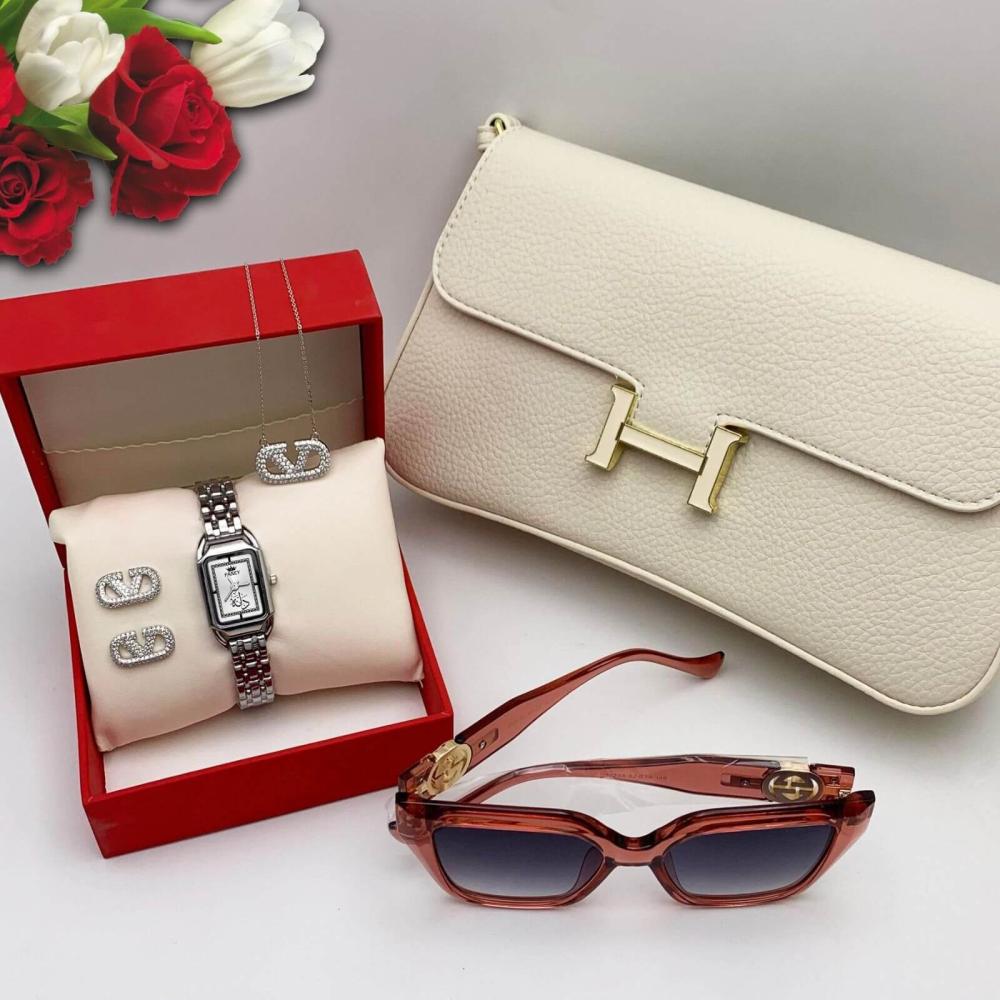 طقم هدايا نسائي فاخر - ساعة، مجوهرات، شنطة مع كرت إهداء