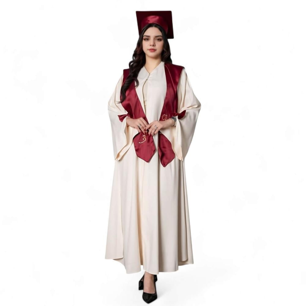 عباية تخرج بلون بيج مع وشاح أحمر فاتح - تصميم فاخر وأنيق