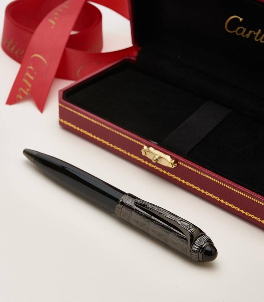 قلم رجالي أسود لامع بغطاء رمادي منقوش