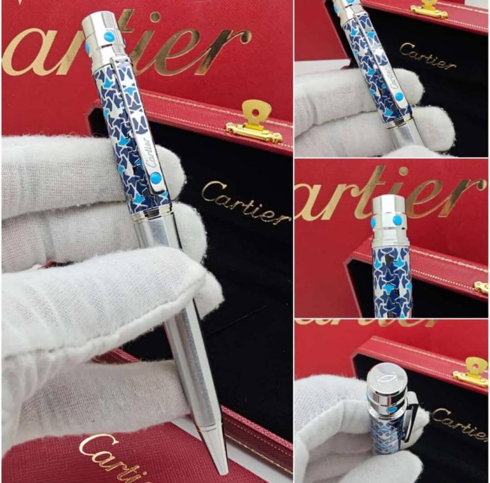 نقدم لك هذا القلم الأنيق الذي يجمع بين الهيكل المعدني الفضي المصقول والغطاء المزين بنقوش النجوم الزرقاء الجذابة. هو ليس مجرد قلم، بل قطعة تعبر عن الذوق العصري والاهتمام بالتفاصيل الدقيقة.