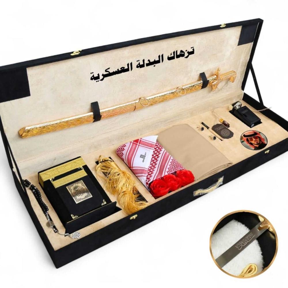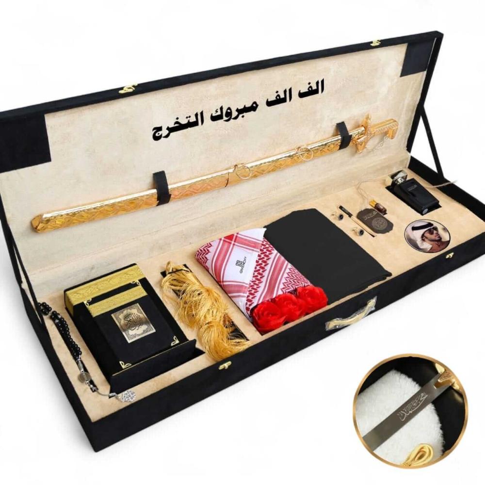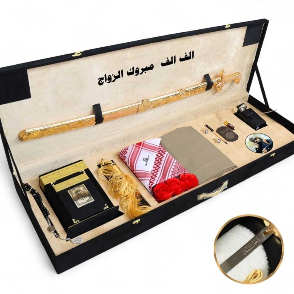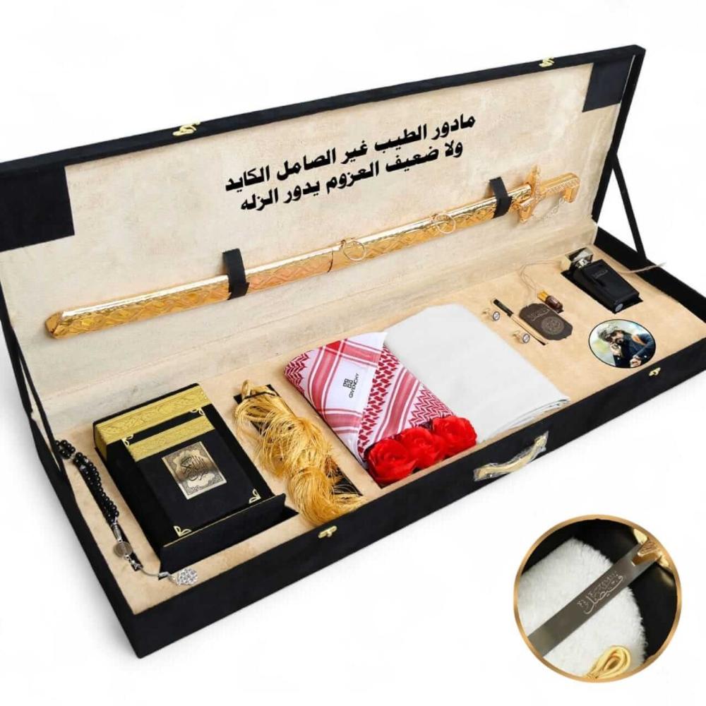 في قلب هذا الصندوق يستقر سيف سوري، رمز الشجاعة والشهامة، صُنع بدقة ليحمل اسم صاحبه ويبقى شاهداً على تقديرك. وبجانبه مصحف كريم ليضفي على الهدية سكينة ووقاراً، ليكتمل مشهد الأصالة التي لا يضاهيها شيء.